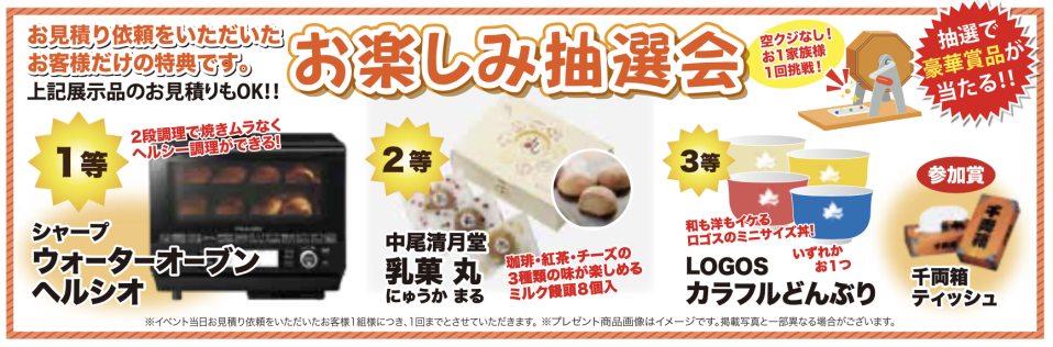 イベント当日お見積もり依頼をいただいたお客様には、ガラポン抽選会で豪華景品をプレゼント!