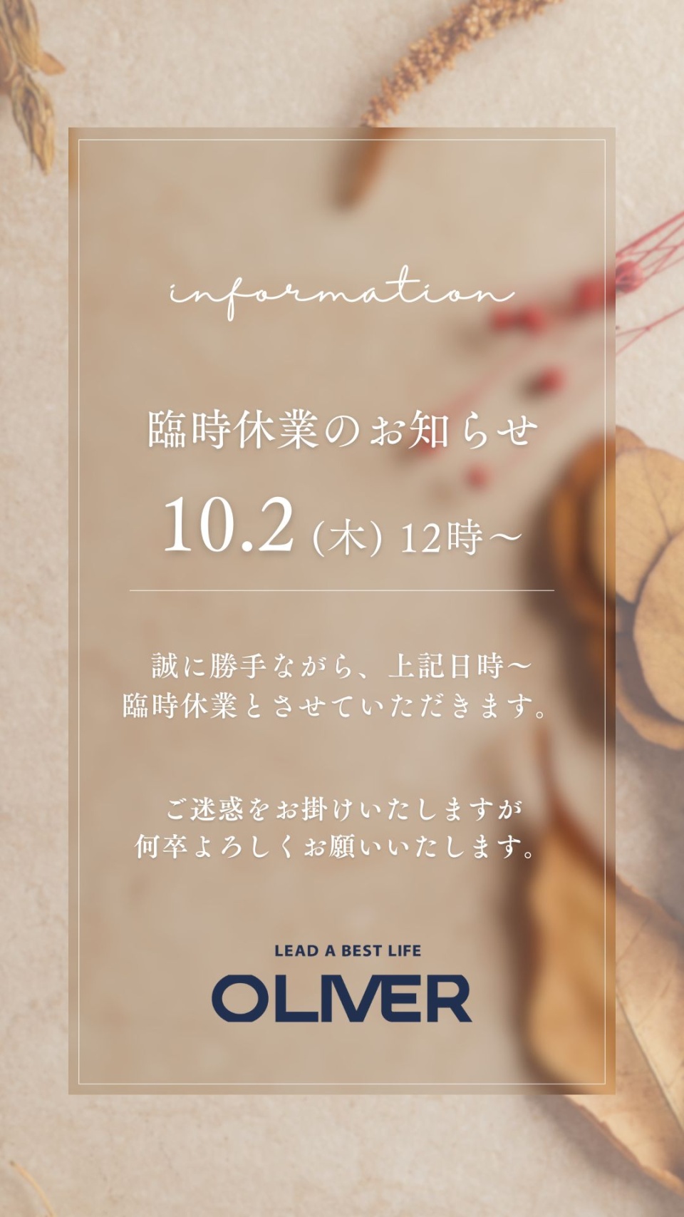 誠に勝手ながら、10月2日(木)は12時〜臨時休業とさせていただきます。