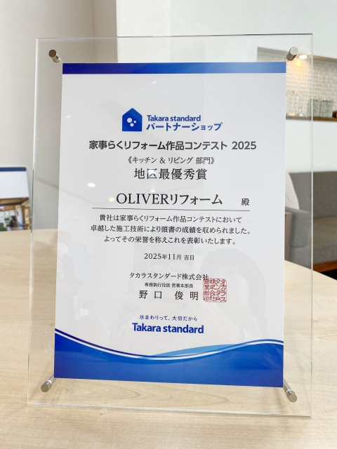 この度、タカラスタンダード家事らくリフォームコンテスト2025 北陸エリア キッチン&リビング部門 最優秀賞 を受賞しました!