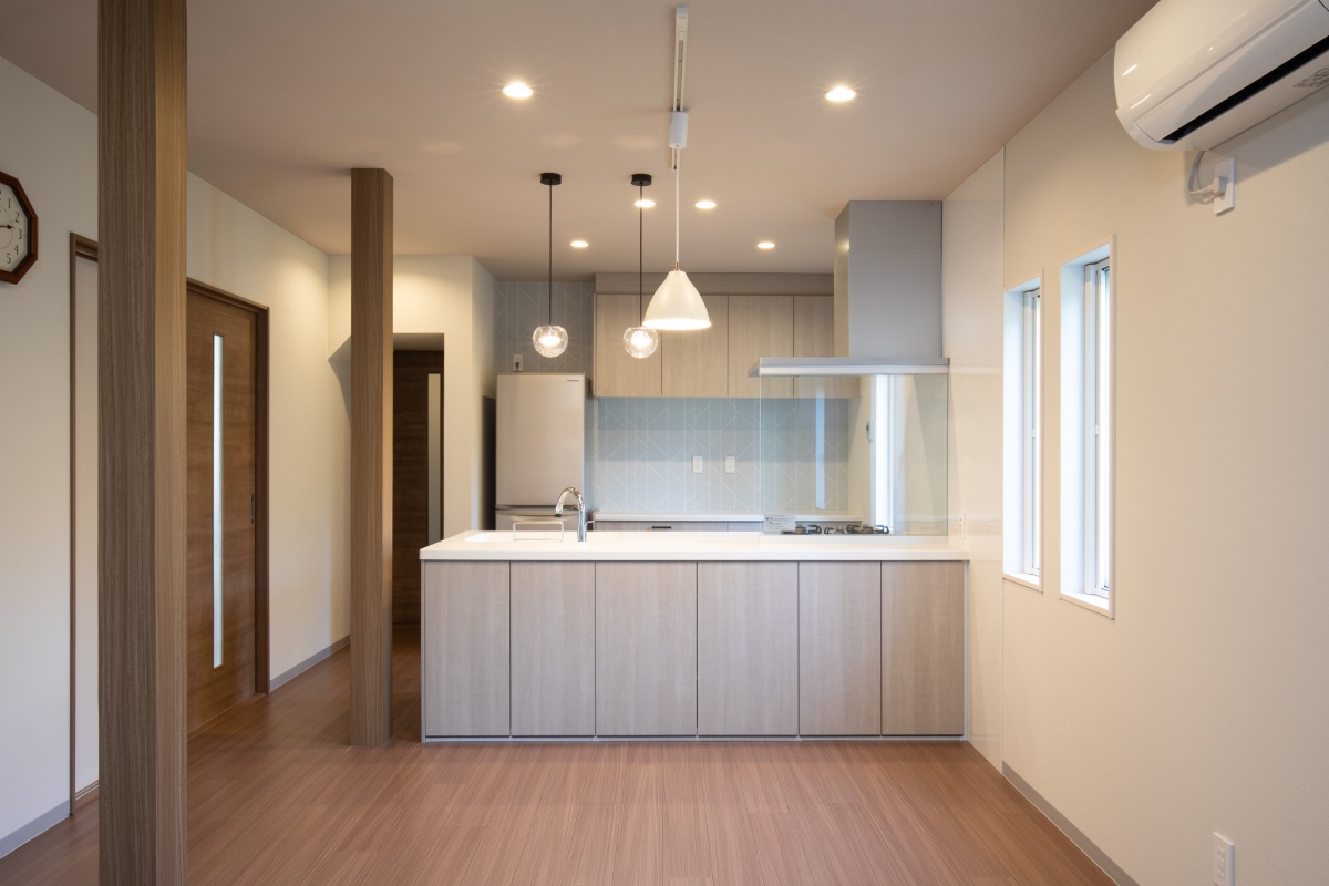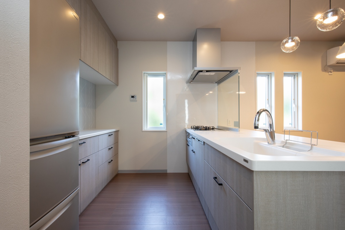 キッチン背面の収納も便利で、機能性とデザインが調和し広い天板を備えた対面スタイルです。
