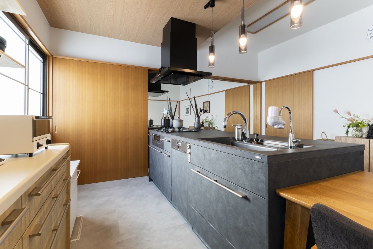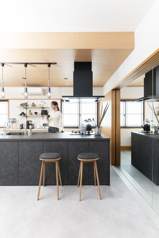 舞踊教室時代の名残である高い天井は、キッチン部分を下がり天井に。換気扇の配管を通すための工夫ですが、下がり天井部分を木目調にすることで、程よいおこもり感とデザインのアクセントが生まれました。また、当初は予定になかった内窓は、YKK APのプラマード・エレガントタイプを採用。黒い格子のデザインが、まるで海外のカフェのような窓辺を演出し、断熱性能とともにインテリアの完成度を一気に高めています。