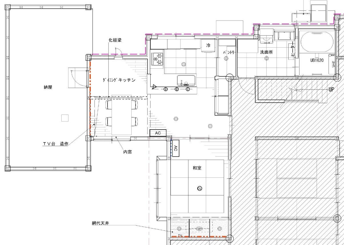 ダイニングは想定より天井高が確保できなかったため、船底天井を採用し、化粧梁で補強。構造的な課題をクリアしながら柱を抜くことにも成功しました。ライン照明を取り入れることで、空間全体をすっきりとした印象に仕上げています。