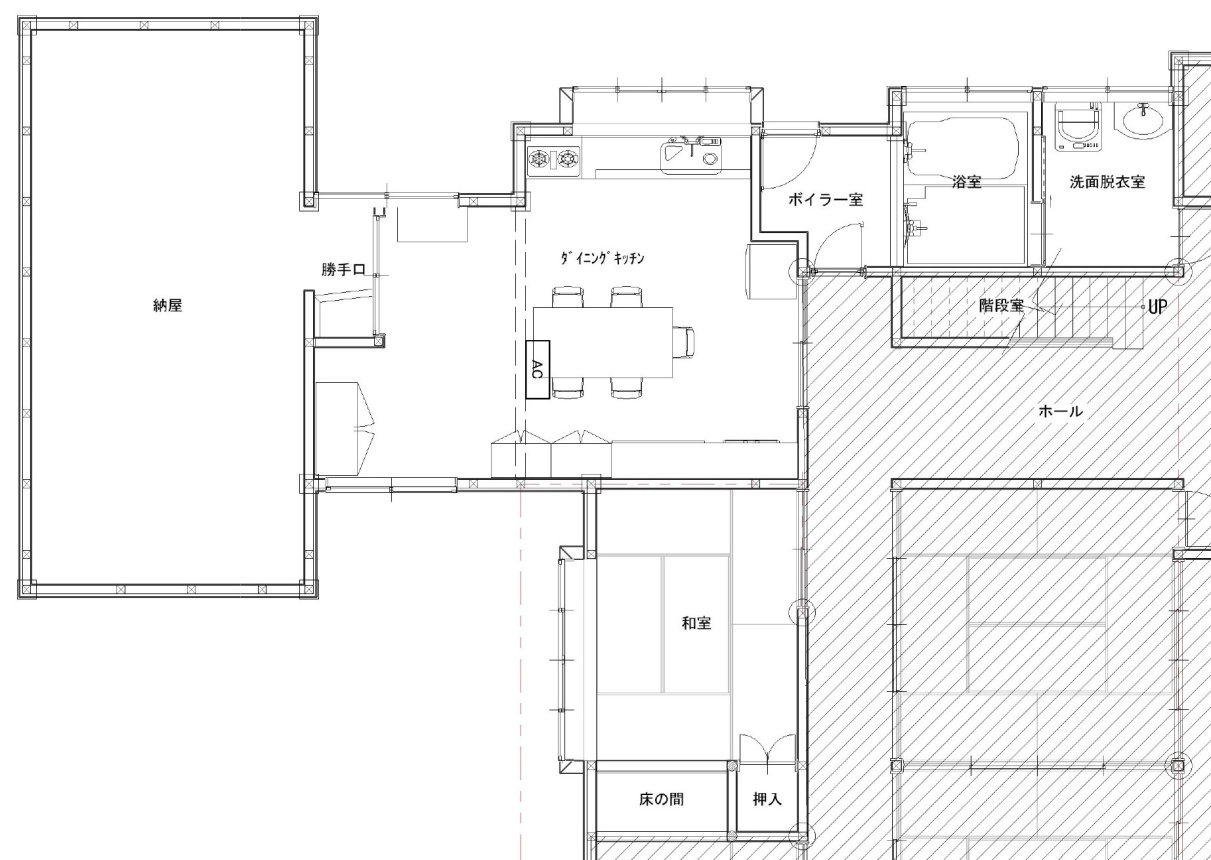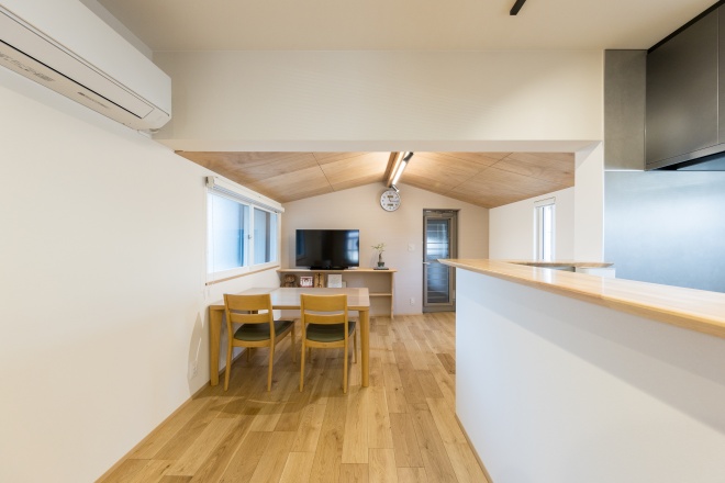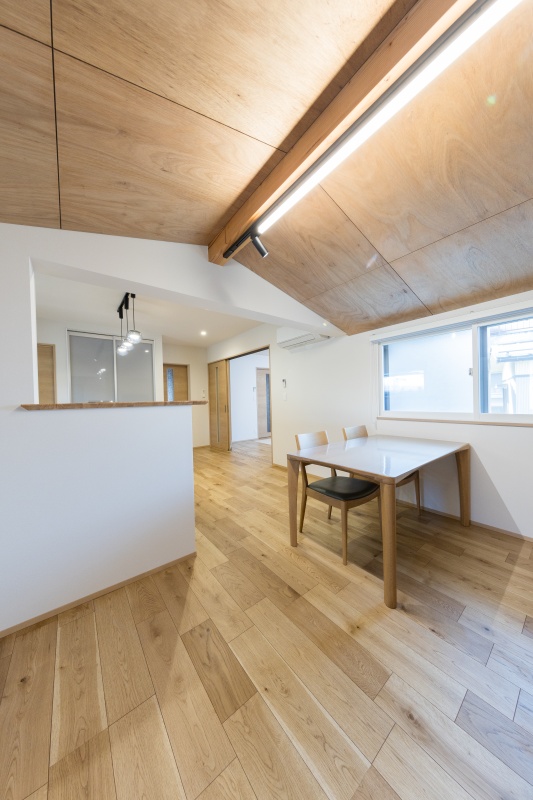 ダイニングは天井をあえて剥き出しにし、船底天井を採用。ラワンベニヤを張ることで素材感を活かし、ライン照明で空間をすっきりと見せました。