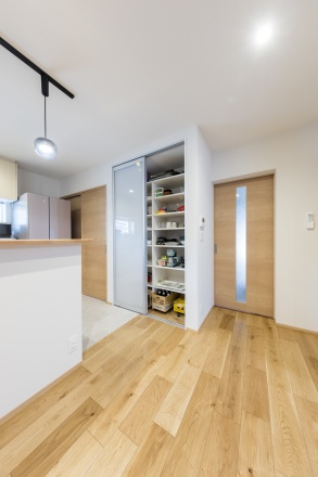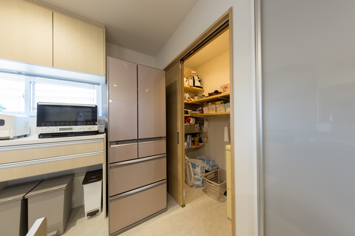 パントリーを設けることで、収納と動線を効率化。物が表に出にくく、すっきりとした空間を保てる設計に仕上げました。