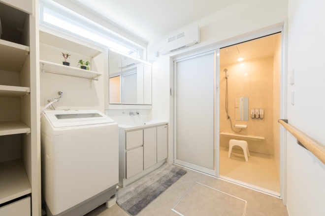 たっぷり収納で使いやすい脱衣スペースに。高窓からやさしい光を取り込みつつ、外からの視線も防ぎます。