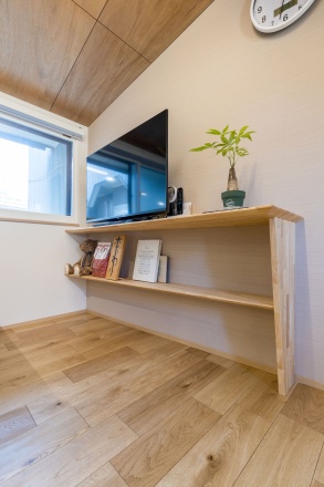 集成材で造作したオリジナルのテレビボード。あえて斜めに配置することで、空間のどこにいても自然にテレビを楽しめる設計です。