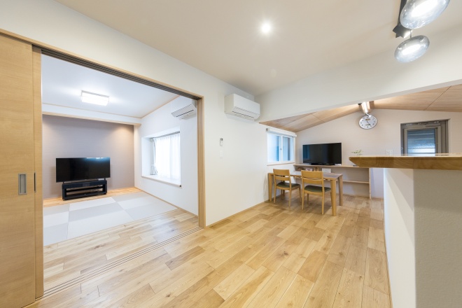 キッチンから続くリビングには、冷暖房効率を高めるため3枚引き戸の間仕切り建具を設置。和室の一部には網代天井を採用し、細部までこだわりを感じられる和の趣を残しています。
