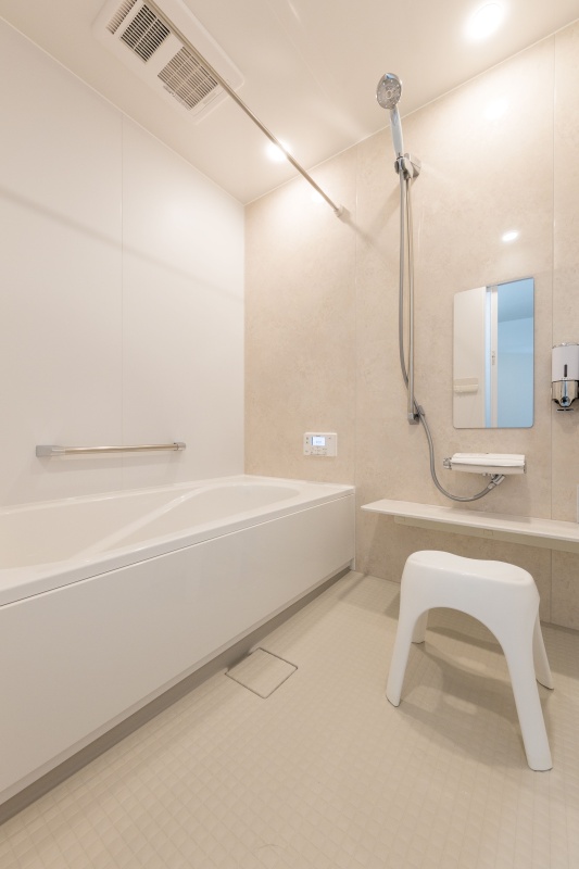 窓をなくすことで断熱性を高め、暖かさを追求したバスルーム。リビングからの動線にも配慮し、使いやすい位置へと配置を見直しました。