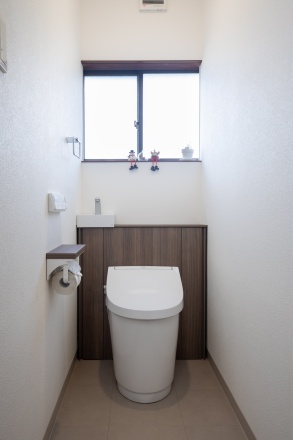 キャビネット一体型ですっきりとした上品な印象のトイレ。ちょっとした収納があるのも便利です。