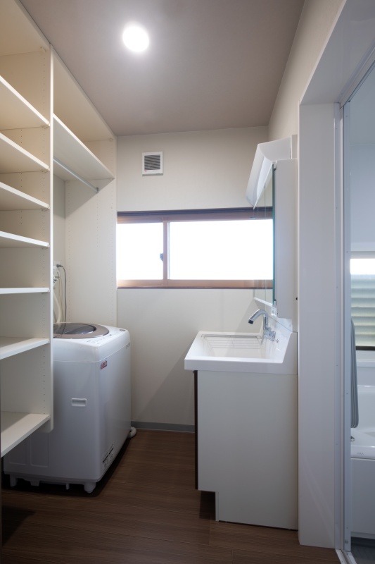 大容量の造り付けのキャビネットで洗面周りが使いやすくもすっきり整います。