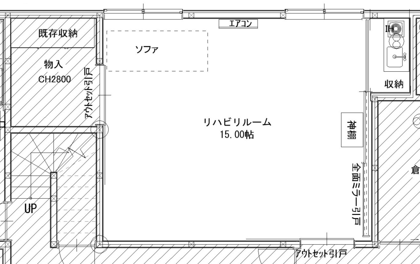 舞踊教室として使われていた名残の一面鏡張り。空間に広がりをもたらしています。