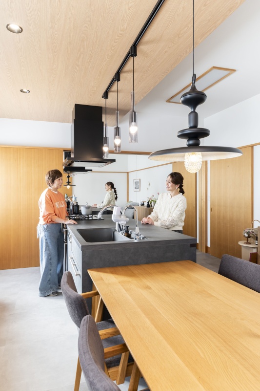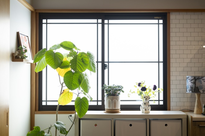 舞踊教室時代の名残である高い天井は、キッチン部分を下がり天井に。換気扇の配管を通すための工夫ですが、下がり天井部分を木目調にすることで、程よいおこもり感とデザインのアクセントが生まれました。また、当初は予定になかった内窓は、YKK APのプラマード・エレガントタイプを採用。黒い格子のデザインが、まるで海外のカフェのような窓辺を演出し、断熱性能とともにインテリアの完成度を一気に高めています。