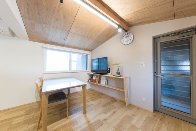 ダイニングは天井をあえて剥き出しにし、船底天井を採用。ラワンベニヤを張ることで素材感を活かし、ライン照明で空間をすっきりと見せました。