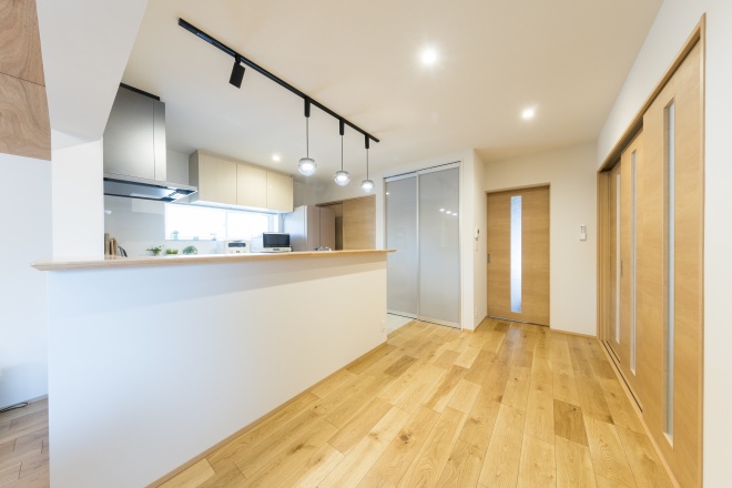 キッチンから続くリビングには、冷暖房効率を高めるため3枚引き戸の間仕切り建具を設置。