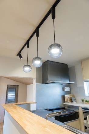 丸みのあるペンダントライトを取り入れ、空間にやわらかなアクセントをプラス。シンプルな中に、さりげない個性を添えています。