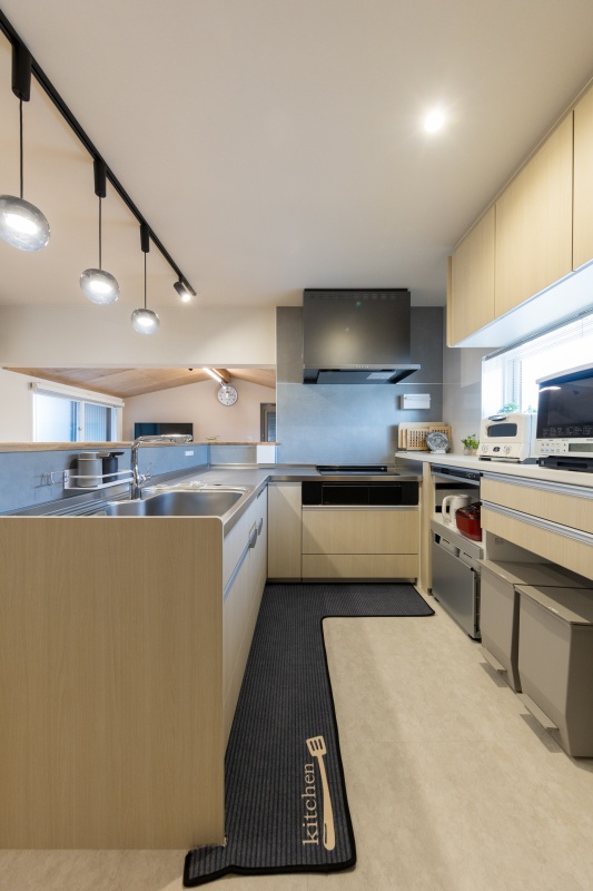 コの字型に配置されたキッチンは、動線がコンパクトで無駄のないレイアウト。快適な家事時間を叶えます。