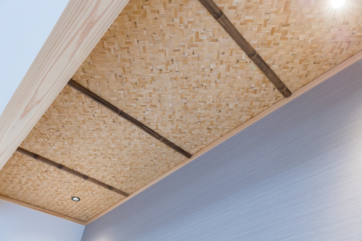 伝統的な網代天井をアクセントにした和室リビング。やわらかなダウンライトの灯りが、落ち着きのあるくつろぎ空間を演出します。
